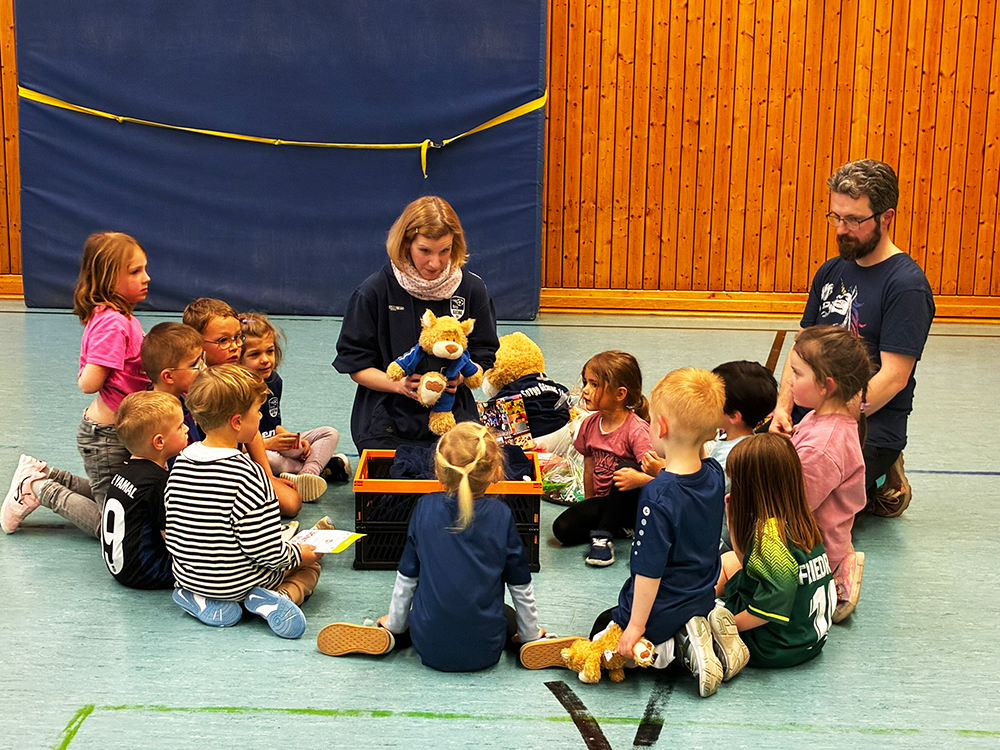 Einige Kinder werden bereits einen Tag später bei der G-Jugend mittrainierren. Für das erste Kennenlernen war auch G-Jugend-Trainer Luc anwesend.